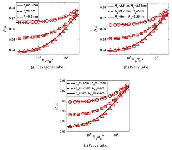 Based on the extended GBR model [32,36], Brownian dynamics simulations were performed for WLCs confined in tubes of different shapes. In all the simulations, the chains were initially set in straight configurations. Tube confinements and stretching forces were then applied during the chains’ relaxation. We recorded the average extension of the chain along the -axis, , at a fixed time increment. For each simulation, the average extension of the corresponding WLC was obtained by first averaging over time and then over numerous independent trajectories obtained by using different random seeds. In all the simulations, we set the persistence length of the WLCs as Lp = 50 nm, the viscosity of the solvent, , the absolute temperature, , bead radius, , bond length, 2.0 nm, time step, 6.0 ps, contour length, 100–120 nm and total simulation time, . For each simulation, ensemble average was performed over 14–200 different trajectories with different random seeds. As we have shown in Appendix A, the extended GBR model can realize the spatial confinement of tubes with complex shapes and the equilibrium states of confined and stretched WLCs can be reached within a few tens microseconds.