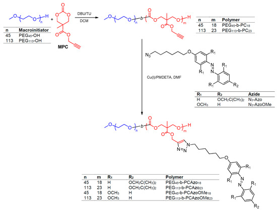 Azobenzene linear-linear block copolymers were obtained as outlined in Figure 1. Bis-MPA is a 1,3-diol that by reaction with ethyl chloroformate can be easily transformed into a six-membered cyclic carbonate monomer that undergoes ring opening polymerization (ROP) under mild conditions with nucleophilic initiators such as alcohols. The polymerization provides an aliphatic polycarbonate with pendant carboxylate groups from which functionality can be implanted along the backbone. Accordingly, copolymers were obtained by organocatalyzed ROP of 5-methyl-5-propargyloxycarbonyl-1,3-dioxan-2-one (MPC) and further post-polymerization functionalization by copper(I) catalyzed azide-alkyne cycloaddition (CuAAC) with an azobenzene azide. ROP was promoted using poly(ethylene glycol) methyl ether (PEGn–OH), acting as a monofunctional macroinitiator, and 1,8-diazabicyclo(5,4,0)undec-7-ene (DBU)/1-(3,5-bis(trifluoromethyl)phenyl)-3-cyclohexylthiourea (TU) as the catalytic system that provides good control over the ROP of different cyclic carbonates and fast polymerization rates [27,28,29]. ROP of MPC was performed in dichloromethane ([MPC]0 = 1.0 M) at 40 °C for 8 h using a [MPC]:[TU]:[DBU] = 1:0.05:0.01 ratio. Two poly(ethylene glycol)s (PEGn–OH) with average polymerizations degrees (n) of 113 and 45 were used while adjusting the [MPC]:[PEGn–OH] ratio to get hydrophobic-to-hydrophilic ratios of about 80:20 wt % on the final azobenzene block copolymers. Polymerizations were confirmed by 1H NMR by the disappearance of the methylenic protons of the carbonate ring, at δ = 4.71 and 4.22 ppm, and the appearance of a new signal, at 4.25 ppm, corresponding to the polycarbonate backbone (Supplementary Materials, Figures S1 and S2). Average polymerization degrees of the polycarbonate segment, m, were determined using 1H NMR end group analysis by comparing relative integration of the terminal methoxy group of the PEG block (δ = 3.31 ppm) and the alkynyl side groups of the polycarbonate block (δ = 2.48 ppm). Values of m were found to be 23 and 18 when using PEG113–OH and PEG45–OH. That matched reasonably well with theoretical ones (30 and 23, respectively). Additionally, SEC traces revealed unimodal distributions with Ð = 1.06 for PEG45-b-PC18 and 1.08 for PEG113-b-PC23 (Supplementary Materials, Figures S3 and S4).