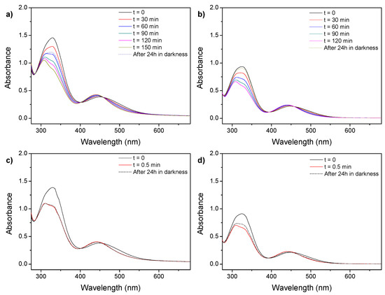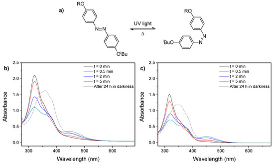 The spectra of the self-assemblies (both micelles and vesicles) aqueous dispersions showed a blue shift of the π–π* band maximum from 360 nm to 320 nm indicative of the prevalent formation of H-aggregates of azobenzene units (Figure 2). Moreover, two weak shoulders were observed, one at 360 nm associated to the non-aggregated azobenzenes and one at 375 nm arising the formation of J-aggregates [19,33,34,35,36,37]. Upon UV illumination, a decrease on the intensity of the π–π* band with a concurrent increase in the absorbance at 450 nm was monitored and associated to the trans-cis photoisomerization and changes of the azobenzene aggregation. No further evolution on the spectra was observed after 5 min of illumination inferring that a photostationary state was reached at this point. After storing the irradiated sample at room temperature for 24 h in the dark, the initial spectra were not recovered as the broad π–π* band was centered at 360 nm (instead of 320 nm), suggesting an azobenzene aggregation different to the observed on the non-irradiated self-assemblies.