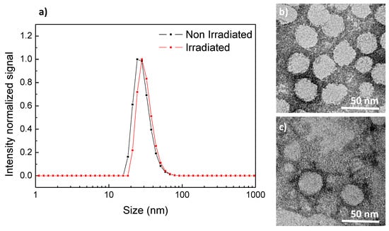 Once the trans-cis photoisomerization of the 4-isobutyloxyazobenzene moieties confined into the hydrophobic regions of the self-assemblies was corroborated, morphological changes of the micelles and vesicles after UV light illumination were studied by TEM and DLS. After 10 min of exposure to UV light PEG113-b-PCAzo23 micelles were still visible across the TEM grid, although its morphology was less defined and was accompanied by organic material without a defined morphology, in a similar way to previous reported azobenzene light-responsive micelles [33] (Figure 3b,c). A slight increase in the size of the micelles was measured by DLS, with Dh going up from 24 nm to 30 nm (Figure 3a).