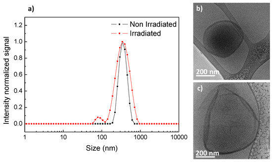 Upon UV illumination, vesicles from PEG45-b-PCAzo18 appeared distorted and wrinkled in the TEM images as in the related linear-dendritic block copolymers previously described with this 4-isobutyloxyazobenzene unit [19,20]. These vesicles were found to coexist with smaller vesicles that were not observed in non-irradiated samples (Supplementary Materials, Figure S16). Alteration of the vesicles was confirmed by Cryo-TEM inspection, where the continuous and smooth vesicle became non-continuous and folded (Figure 4b,c and Figure S17). In accordance, by DLS, an increase in the size dispersity of the self-assemblies and the appearance of a second smaller size population was observed (Figure 4a).