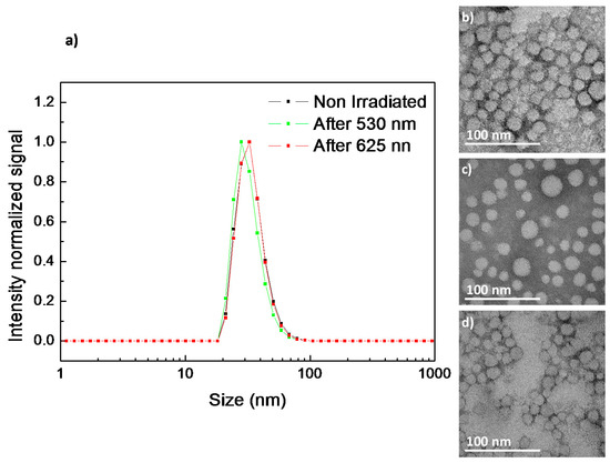 According to TEM images and DLS analysis, micelles of PEG113-b-PCAzoOMe23 remained relatively stable after 2 h under 625 nm light exposure (Figure 6a,c). However, they were affected by the action of 530 nm light. After 5 min, a slight modification in size was registered by DLS, with the average dimeter decreasing from 30 to 27 nm (Figure 6a). On the TEM images, the unmodified micelles coexisted with smaller ones (Figure 6d).