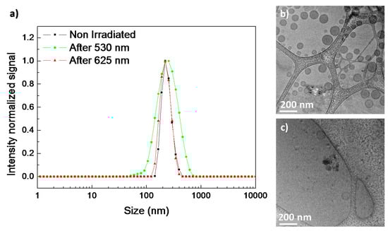 When the vesicles dispersion of PEG45-b-PCAzoOMe18 was exposed to 625 nm light for up to 2 h, the effect of illumination on the self-assemblies was negligible according to TEM images (Supplementary Materials, Figure S19) and DLS measurements (Figure 7a). However, after 5 min under 530 nm light a remarkable increase in the size dispersity of the self-assemblies was monitored by DLS (Figure 7a) as a consequence of the trans-cis isomerization. Disruption of the vesicle morphology was confirmed by TEM (Supplementary Materials, Figure S19) and Cryo-TEM (Figure 7c), as the number of vesicle diminishes after 530 nm light irradiation.