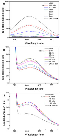 After having evaluated the light-response of micelles and vesicles, their potential capability as light responsive, in particular visible responsive, nanocarriers were tested by using fluorescent molecular probes. Micelles were loaded at the internal core with the well-known hydrophobic fluorescent probe, Nile Red and the changes on the emission intensity registered at different light exposure times (Figure 8). Nile Red loaded PEG113-b-PCAzo23 micelles showed an intense and broad emission band located at 610 nm (when exciting at 550 nm) that sharply decreased during the UV illumination process (Figure 8a). The emission was only partially recovered after 24 h in dark, which seems to evidence that Nile Red is released from the hydrophobic micelle core [20].