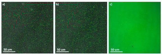 Vesicles of PEG45-b-PCAzo18 and PEG45-b-PCAzoOMe18 were loaded with Rhodamine B which, given its hydrophilic character, would be trapped inside the aqueous cavity of the vesicle. The encapsulation and light induced release of Rhodamine B was monitored by confocal microscopy. Images of the initial samples showed fluorescence dots on a dark background verifying the entrapment of the fluorescent probe inside the vesicles (Supplementary Materials, Figure S22 and Figure 10a). The number of encapsulated molecules was determined by HPLC, being 0.1 molecules of Rhodamine B per block copolymer chain (experimental details are given in Experimental Section). Images collected for vesicles of PEG45-b-PCAzo18 after being exposed for 10 min to UV light exhibited a fluorescent background as a consequence of the photoinduced release of Rhodamine B from the vesicles inner cavity to the surrounding media (Supplementary Materials, Figure S22) [19,41]. For vesicles of PEG45-b-PCAzoOMe18, differences were very clear depending on the illumination wavelength. After 2 h at 625 nm light illumination, the fluorescence dots were still visible and the background remained dark, that is to say, the isomerization induced by 625 nm illumination did not stimulate the release of the encapsulated Rhodamine B (Figure 10b). However, in the sample illuminated with 530 nm light for 5 min, the fluorescence is extended all over the background, being still visible some fluorescence dots (Figure 10c).