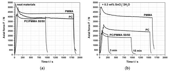 Force vs. time curves of (a) neat polycarbonate (PC), neat polymethylmethacrylate (PMMA), and PC/PMMA 50/50 in the absence of any catalyst and (b) of the same materials in presence of 0.3 wt% SnCl2∙2H2O catalyst.