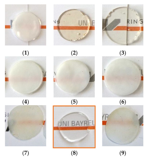 Of the investigated catalysts only the SnCl2∙2H2O reference catalyst (Figure 3(2)), the anhydrous SnCl2 (Figure 3(3)), and the phosphonium salt (Figure 3(8)) resulted in transparent blends. However, while the blends produced with both tin chloride catalysts show brownish color, only the phosphonium salt resulted in a completely transparent and, at the same time, colorless blend. Torque of the extruder was reduced for all the compositions resulting in transparent blends compared to the compositions produced with catalysts resulting in opaque blends.