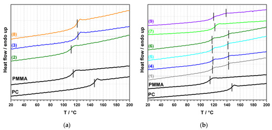 Differential scanning calorimetry (DSC) from Mettler Toledo (Columbus, OH, USA) was carried out to investigate the change in glass transition temperatures (Tg) of the different PC/PMMA blends. The measurements were done under nitrogen atmosphere at a heating/cooling rate of 10 K/min. The samples were heated from 0 to 200 °C, held at 200 °C for 3 min, and then cooled down to 0 °C. This depicted the first run. For the determination of the Tg the 2nd heating curves were used, which consist of the same temperature program as the 1st run.