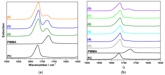 In the FTIR spectra of the acetone insoluble portions of all transparent blends, two clearly distinct carbonyl stretching vibration bends at 1720 cm−1 (assigned to PMMA) and at 1770 cm−1 (assigned to PC) are observed. A blend fraction that is not soluble in acetone, but nevertheless contains a significant amount of PMMA is strong indication for formation of a PC-g-PMMA copolymer by transesterification in these materials. PMMA that is not chemically bonded to PC had been proven to be completely soluble in acetone under the applied conditions (see experimental part above). On the other hand, the FTIR spectra of the acetone insoluble fractions of the opaque blends (Figure 6b) show essentially only the bend at 1770 cm−1, i.e., this fraction of the opaque blends contains essentially only polycarbonate. Our conclusion is that the opaque PC/PMMA blends actually do not contain any significant amounts of PC-g-PMMA copolymer, i.e., practically no transesterification occurred during their compounding. As a proof of this interpretation, FTIR investigations have also been performed on the acetone soluble fractions of the opaque PC/PMMA blends. All spectra exhibited only a single carbonyl stretching vibration bend at 1720 cm−1 related to PMMA, so did not provide any indication for presence of PC-g-PMMA copolymer with potentially lower block length of the PC that could be imagined to be soluble in acetone. The opaque material produced with zinc acetylacetonate as catalyst (Figure 6b(9)) likely contains a minor fraction of PC-g-PMMA copolymer as indicated by the small shoulder at 1720 cm−1 in the respective FTIR spectrum of its acetone insoluble fraction. Obviously, the amount of the PC-g-PMMA copolymer generated via transesterification in the presence of zinc acetylacetonate is; however, insufficient to result in a transparent blend—at least at the molecular weights of the PC and PMMA resulting in this particular blend upon compounding.
