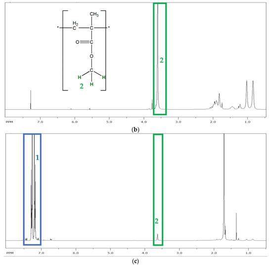 1H-NMR was used to quantify the content of PC-g-PMMA formation during reactive extrusion of PC and PMMA in presence of 0.05 wt% of the phosphonium salt catalyst. For this purpose, 1H-NMR spectra of the neat PC and PMMA raw materials as well as the acetone insoluble part of the PC/PMMA 50/50 blend were recorded. In each case, 30 mg of the investigated material was completely dissolved in about 0.8 mL deuterated chloroform. The NMR spectra were recorded with a Bruker Avance (Billerica, MA, USA) with 300 MHz at room temperature.