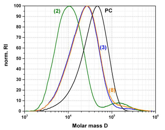 Molecular weight distribution curves measured by GPC of the pure PC raw material as comparison and of the acetone insoluble parts of the transparent PC/PMMA 50/50 blends produced in presence of 0.05 wt% of catalysts SnCl2∙2H2O (2), anhydrous SnCl2 (3), and phosphonium salt (8).