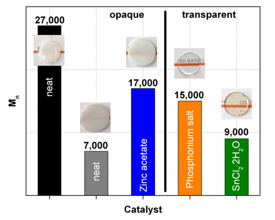 Illustration of the correlation of the haze and the molecular weights (numbers above the columns represent the according values of Mn) of the acetone insoluble fraction of PC/PMMA 50/50 blends produced in absence of a catalysts (neat) or in presence of 0.05 wt% of zinc acetate, phosphonium salt, and SnCl2⋅2H2O. FTIR investigation of the acetone insoluble fractions of the blends produced with phosphonium salt and SnCl2⋅2H2O had proven the presence of PC-g-PMMA copolymer in these materials, while all other blends shown here did not contain any such potential compatibilizer. The grey bar represents a PC/PMMA 50/50 blend produced in absence of a catalyst with the same PMMA as used in the other blends, but with a PC raw material of lower molecular weight.