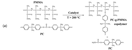 - Montaudo, G.; Puglisi, C.; Samperi, F. Chemical reactions occurring in the thermal treatment of PC/PMMA blends, J. Polym. Sci. Part A Polym. Chem. 1998, 36, 1873–1884. [Google Scholar] [CrossRef]