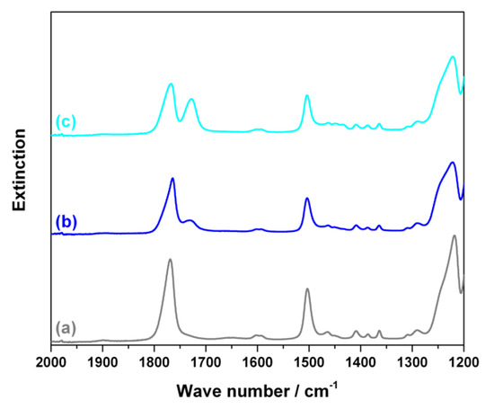 Targeting verification of this hypothesized transesterification mechanism, we performed additional compounding experiments on the ZSK26 MC18. PC/PMMA 50/50 blends were produced in presence of 0.05 wt% of phosphonium salt starting from PC and PMMA raw materials that, in the first experiment, were used without prior treatment (i.e., equilibrated in ambient air) and in a second experiment were predried in vacuum at 60 °C for 4 h. The FTIR spectra of the acetone insoluble portions of the produced PC/PMMA blends prove that a higher content of PC-g-PMMA copolymer has formed in the experiment in which the raw materials have not been dried prior to compounding, i.e., have contained a higher content of residual moisture (Figure 11). This finding cannot be explained by the one-step cross-transesterification mechanism as proposed by Singh et al. [6] and thus is strong support of the two-step mechanism depicted in Figure 10b postulated here.
