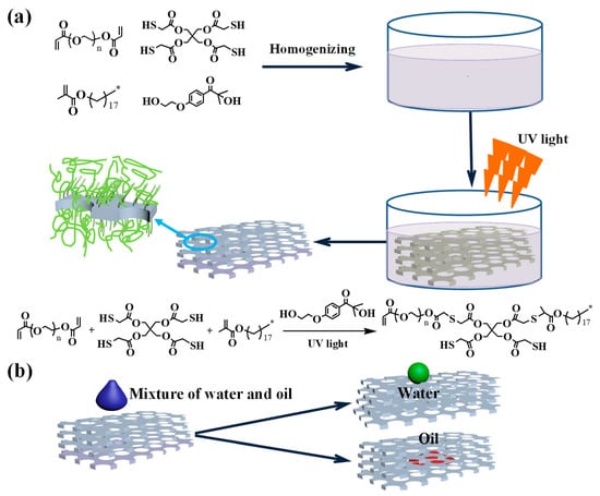Herein, a PU sponge with hydrophobic/oleophilic property was prepared based on the thiol–ene click reaction, which was a simple method with only one step. Photopolymerization was induced through UV light on the sponge surface in a homogeneous solution. Pentaerythritol (mercaptoacetic acid) ester and octadecyl methacrylate as the reactive monomer, polyethylene glycol diacrylate as a crosslinker, 2-hydroxy-4′-(2-hydroxyethoxy)-2-methylpropiophenone as a photoinitiator. The schematic illustration of the modification process for sponge based on the thiol–ene click reaction and the process of oil/water separation are presented in Figure 1. The as-prepared sponge possessed excellent selectivity for oil from various types of oil/water mixtures. It created a new method to prepare oil/water separation sponge.