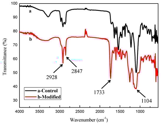 FTIR spectra of PU sponge: (a) control, (b) after modifying based on the thiol–ene click reaction.