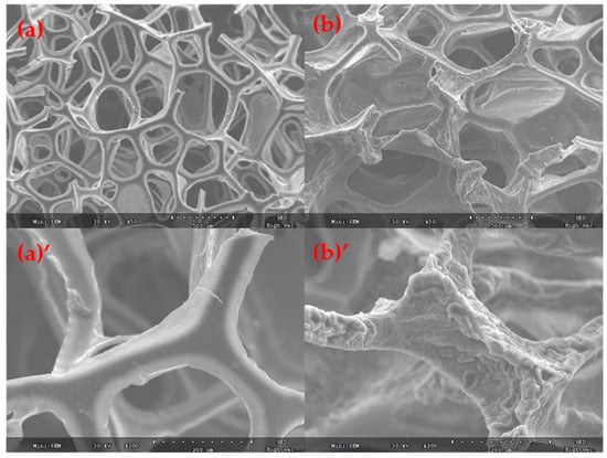 SEM images of PU sponge: (a) control, (a′) a microgram of blank sponge at high magnification resolution, (b) PU sponge after modifying, and (b′) a microgram of modifying sponge at high magnification resolution.