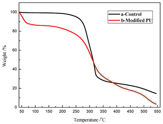 The TG curves of PU sponge before and after modifying: (a) control, (b) the modified sponge.