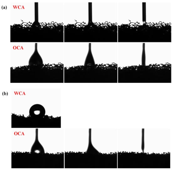 To evaluate the surface wettability of pristine and modified sponge, the contact angle was investigated, and the results were shown in Figure 5. The unmodified sponge could be easily wetted by both water and oil, it’s because of the superhydrophilicity and superoleophilicity of the pristine sponge, and the water and oil contact angles were both 0° (Figure 5a). However, the sponge changed its wettability after surface modification: the water droplet on the surface exhibited spherical shape with water contact angle of 159° (Figure 5b). By contrast, the value was higher than some reported works, such as the superhydrophobic sponge with a water contact angle of 157.0° ± 0.3° fabricated by Huang [], and a thermo-responsive sponge with the highest water contact angle of 150° fabricated by Lei []. Meanwhile, the modified sponge could still be completely wetted by oil droplets with an oil contact angle of 0°. This indicated that the modified sponge had good hydrophobic/oleophilic properties.