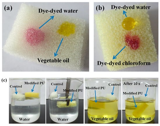 To further compare their surface wettability properties, the appearance of water and oil droplets on the surface of sponge were investigated. Figure 6a shows the images of a water droplet (dyed by dyestuff to be observed easily) and a vegetable oil droplet on the pristine sponge. The unmodified sponge could be easily wetted by both water and oil because of the superhydrophilicity and superoleophilicity of the pristine sponge. However, based on the images of a water droplet (dyed by dyestuff) and a chloroform droplet (dyed by dyestuff) on the modified sponge in Figure 6b, the water droplet exhibited stable spherical shape on the surface of modified sponge because of the alkyl chain with the low surface tension. Meanwhile, the oil droplet could spread and permeate into its inner because of strong lipophilicity and the capillary force. When the sponge before and after modifying were put on water and oil surface (Figure 6c), it was found that the modified sponge could float on water surface during the entire test process because of its hydrophobicity and light weight. Furthermore, a mirror-like phenomenon was found when modified sponge was immersed in water using an external force, which was a result of a uniform air layer trapped between the hydrophobic surface and water. However, the modified sponge was put on the surface of vegetable oil, it could immerse into oil quickly after about 10 s because of its good oleophilic property.