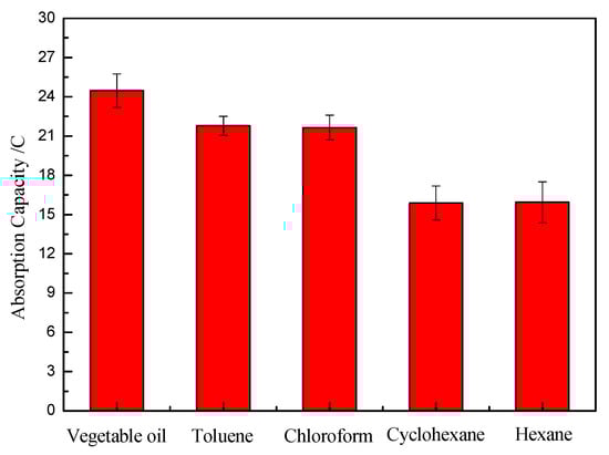 The absorption capacities of modified sponge for various types of oils and organic solvents were investigated, including vegetable oil, toluene, chloroform, cyclohexane, and hexane. The absorption capacity was calculated according to the following formula, C (%) = ((n − n0)/n0) × 100%, where C (%) is the absorption capacity, and n0 and n are the weight of the as-prepared sponge before and after absorption with oil, respectively. As shown in Figure 7, the results of all were above 15 times, and above 24 times for vegetable oil. The good absorption property was attributed to the strong capillary effect, high 3D hierarchical porous structure, and low surface energy. Thus, the as-prepared sponge exhibited greater potential in oil adsorption applications.