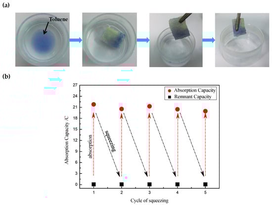(a) The oil/water separation processes of the modified sponge and the collection of toluene (dyed by dyestuff) from water surface; (b) the changes of absorption capacity for vegetable oil after five squeezing cycles using the modified sponge.