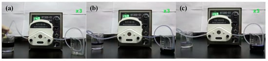 The successive oil/water separation of as-prepared sponge was further studied using a peristaltic pump, as shown in Figure 9a. The device consisted of a peristaltic pump, and a rubber tube tied with modified sponge. Figure 9b displayed the separation process of toluene (colored for clear observation) from water. It showed that a stream of toluene was formed when turned on the peristaltic pump. Toluene could be separated continuously, and level of toluene was declined gradually (Video S1 in Supplementary Materials). After a few minutes, there was no remaining toluene to be found on the water’s surface. Furthermore, there was almost no water could be seen in the collected toluene (Figure 9c). The results indicated that as-prepared sponge showed high selectivity and good separation efficiency, and it would have the potential application in oil/water separation.