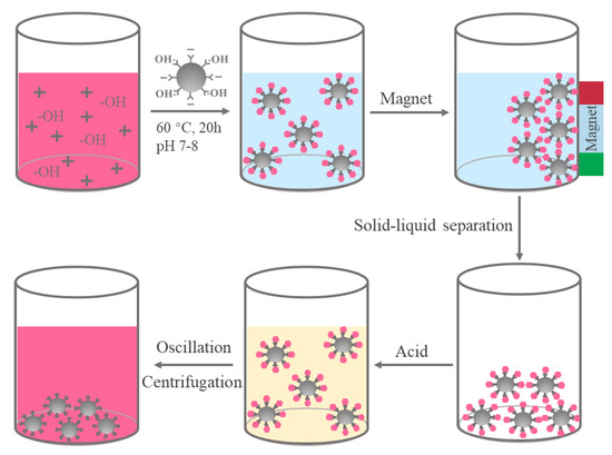 A magnetic delivery system which could be stabilized by physical intermolecular or covalent cross-linking by altering temperatures or pH values is based on the surface modified by polymers [25]. The schematic illustration of the preparation route for the Fe3O4/anthocyanin magnetic biocomposite was depicted in Figure 1. An anthocyanin linkage way with metal oxide to form the metal oxide–anthocyanin complex was proposed in this work. The complex was first prepared in weak alkaline solution with the temperature of 60 °C for 20 h, and solid –liquid separation was carried out under magnetic field to collect the solids. Eventually, an acidic solution was added to release anthocyanin.