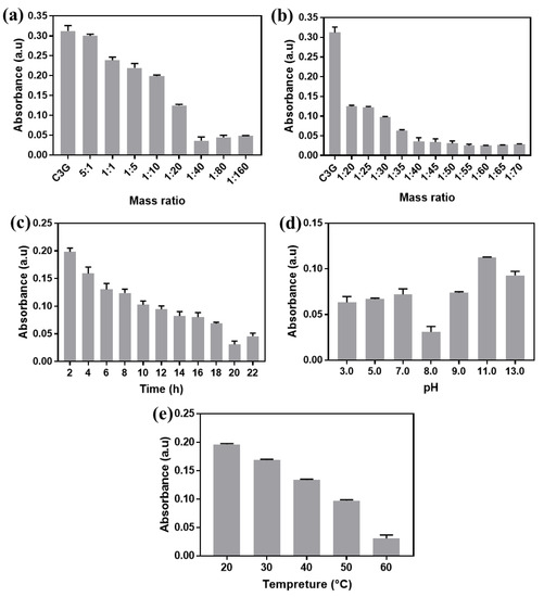 The UV–vis absorbances of Fe3O4/anthocyanin magnetic biocomposites with (a,b) different anthocyanin and Fe3O4 mass ratios; (c) different reaction times; (d) different pH; and (e) different reaction temperatures.