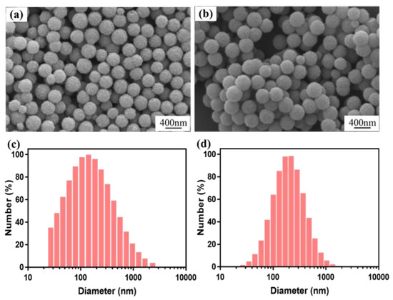Scanning electron microscope (SEM) images of (a) Fe3O4 nanoparticles and (b) Fe3O4/anthocyanin magnetic biocomposites. Particle size distributions of Fe3O4 (c) and Fe3O4/anthocyanin composite (d) by dynamic light scattering (DLS) analysis.