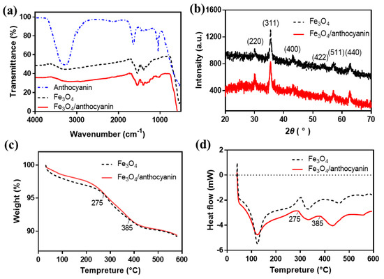 (a) Fourier transformation infrared spectra (FTIR) spectra of anthocyanin, Fe3O4 and Fe3O4/anthocyanin composites; (b) X-ray diffractometry (XRD) patterns, (c) thermogravimetric analysis (TGA) curves and (d) differential scanning calorimetry (DSC) curves of Fe3O4 and Fe3O4/anthocyanin composites.