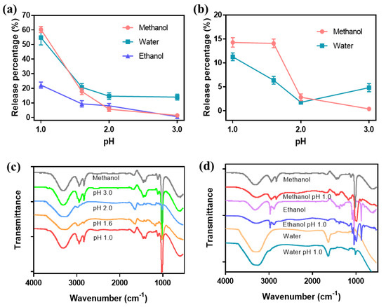 Figure 5c showed the FTIR spectra of released anthocyanin in methanol solutions with different pH values. When the pH was 3.0, the infrared spectrum was almost the same with methanol, indicating nearly no release of anthocyanin. When the pH was 2.0, 1.6 and 1.0, the peaks at 3270, 2980, 1400 and 1020 cm−1 represent the –OH groups, symmetric –CH groups, –OH groups, and C–O groups, respectively. When the pH decreased from 3.0 to 1.0, the O–H peak gradually shifted from 3310 cm−1 to 3270 cm−1, indicating the hydroxyl groups of methanol gradually changed into the hydroxyl groups of anthocyanin. Figure 5d showed the FTIR spectra of released anthocyanin when methanol, water and ethanol were used as solvents, respectively. The groups of the released anthocyanin were affected by the solvents.