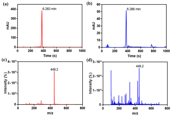 The anthocyanin before compounding and after releasing were also analyzed by HPLC and HPLC-MS to verify the chemical structures, and the results were shown in Figure 6. The structure of cyanidin-3-O-glucoside standard was shown in Figure S4. There was only one adsorption peak at 520 nm in the HPLC profile (Figure 6b), and the corresponding retention time was 6.286 min, which was quite similar to the retention time of the standard spectrum of cyanidin-3-O-glucoside (6.283 min in Figure 6a). Besides, the ions at the mass-to-charge ratio (m/z) 449 (Figure 6c,d) in the positive ionization mode were tested, which indicated that the released anthocyanin mainly consisted of cyanidin-3-O-glucoside and some other derivatives [36,37,38].