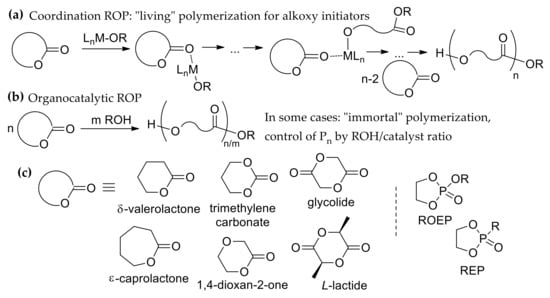 Coordination (a) and organocatalytic (b) ring-opening polymerization (ROP); (c) cyclic esters, monomers for ROP.