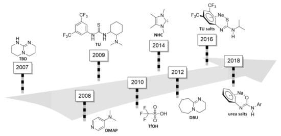 The possibility of DMAP acting both as a hydrogen bond acceptor (through its basic nitrogen center) and a weak hydrogen bond donor (through one ortho-hydrogen atom) was the fundamental finding of the work []. Such behaviour was highly similar to the catalyst action of the 1,5,7-triazabicyclo[4.4.0]dec-5-ene (TBD) and other basic catalysts that are discussed in Section 4, Section 5, Section 6 and Section 7.