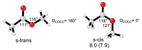 Geometries of s-trans and s-cis methyl acetate and relative Gibbs free energies (kcal/mol) of s-cis methyl acetate determined experimentally and calculated (in parentness). Reprinted with permission from []. Copyright (2008) American Chemical Society.