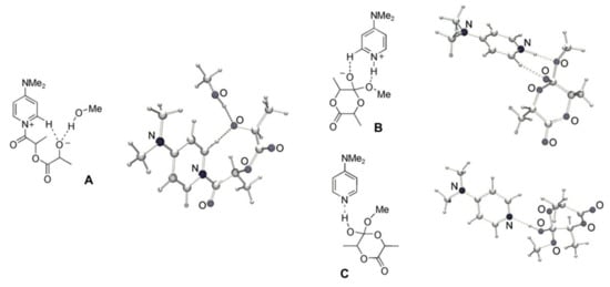 Optimized structures for the acylpyridinium intermediate A (nucleophilic/monomer mechanism) and tetrahedral intermediates B and C (basic/alcohol mechanism). Reprinted with permission from []. Copyright (2008) Wiley-VCH Verlag GmbH & Co.