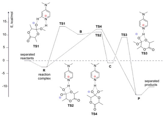 The transition states TS1 and TS2, which connect the zwitterionic intermediate B to the ternary complex of reactants R and the neutral intermediate C, respectively, were located. TS1 and TS2 were both very close in energy to B, with barrier heights of only a few kcal/mol. In addition, C connected with the products P via TS3, with a barrier height of approximately 10 kcal/mol in CH2Cl2. The possibility of a concerted ring-opening reaction of l-LA with MeOH was also estimated, and the corresponding transition state TS4 was indeed found to directly connect R with P (Figure 5). The barrier height calculated for TS4 was comparable to the barrier that was predicted for the stepwise reaction (TS1), thus suggesting that the ROP might occur in a stepwise or concerted manner (Figure 5). It was found that lacOCA methanolysis (Figure 6a), which models the ROP of l-lacOCA, was more favorable than l-LA methanolysis. The decomposition occurs over two stages; the ring-opening step provides the major part of the enthalpic term, whereas the decarboxylation step plays a key role entropically.