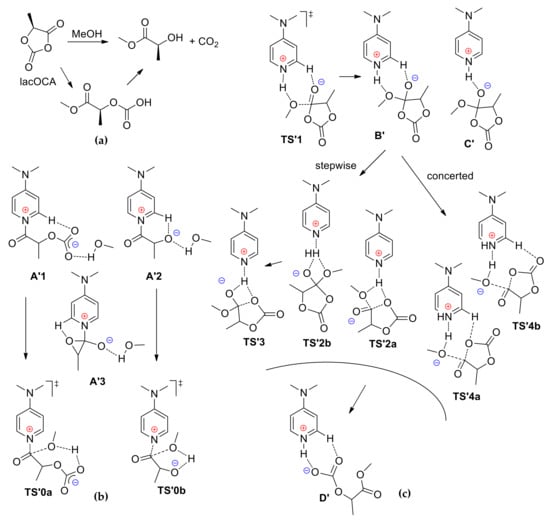 Methanolysis of lactic O-carboxylic anhydride (lacOCA) (a); Intermediates and transition states of the reaction for nucleophilic/monomer (b) and basic/alcohol (c) mechanisms [].