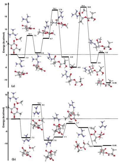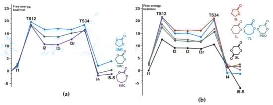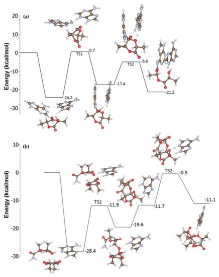 The reaction energy profiles (electronic energies with zero-point corrections) for initiation (a) and propagation (b) stages of adenine-catalyzed l-LA ROP. Reprinted with permission from []. Copyright (2016) Royal Society of Chemistry.