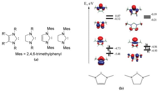 (a) The common structures of imidazole- and imidazoline-based N-heterocyclic carbenes (NHCs) and mesityl-substituted carbenes initially used in ROP of cyclic esters [,]; (b) The view and energies (eV) of two highest occupied molecular orbitals (HOMO) and two lowest occupied molecular orbitals (LUMO) of imidazole- and imidazoline-derived carbenes calculated while using Natural Bond Orbital (NBO) program. Reprinted with permission from []. Copyright (2009) Royal Society of Chemistry.