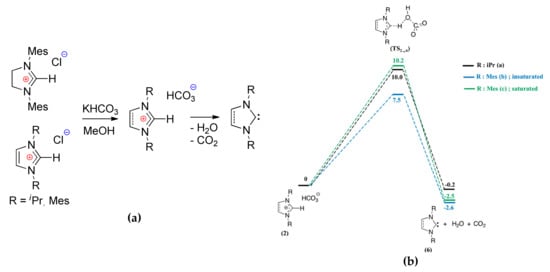 (a) Generation of NHCs from the corresponding hydrogen carbonates; (b) Energy profile calculated for decomposition of NHC hydrogen carbonates (free energies at 25 °C including zero point energy (ZPE) corrections, kcal/mol). Reprinted with permission from []. Copyright (2012) American Chemical Society.