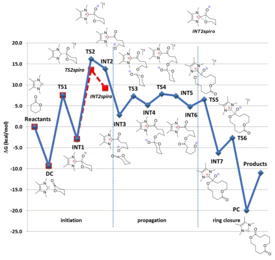 The hydrogen-bonding mechanism is preferable in base-catalyzed ROP if ROH initiator presents in the reaction mixtures, as was demonstrated for DMAP-catalyzed ROP (see Section 3). However, the high nucleophilicity and basicity of NHCs allows for the zwitterionic mechanisms to be competitive under the mild reaction conditions. Without ROH initiator, NHCs may act as strong nucleophiles that form low-energy adducts with cyclic esters; these adducts can undergo ring-opening without the assistance of ROH initiator. Such a reaction pathway can lead to the formation of macrocyclic polyesters [,] and poly(ethylene phosphate)s [] that exhibit intriguing properties. The formation of these polymers from δVL was the subject of the investigation of Waymouth et al. [], who included thorough DFT modeling of the reaction catalyzed by tetramethyl-substituted NHC at B3LYP/6-311+G(2d,p) [,,,,] level of theory. The calculations of the reaction pathway leading to the formation of cyclic δVL dimer found that the highest activation barrier in the whole process was located at the ring-opening of the tetrahedral intermediate INT1 that resulted from nucleophilic attack of the NHC on the δVL carbonyl moiety (Figure 10). Non-aromatic intermediate INT2spiro (Figure 10) has proven to be a dead end stationary point, the only relaxation to INT1 was found for this molecule. Note that useful information regarding charge distribution in transition states presented in Figure 10 was also provided in [].