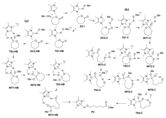 Computed stationary points and transition states for MeOH-assisted hydrogen-bonding (a) and nucleophilic (b) mechanisms of NHC-catalyzed εCL ROP [].