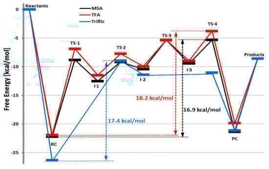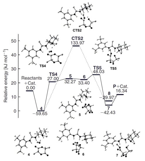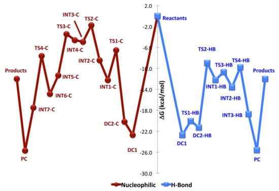 Energy profile and structures obtained for the reaction between β-propiolactone and MeOH. Reprinted with permission from []. Copyright (2007) American Chemical Society.