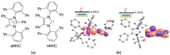 (a) The abnormal (aNHC) and normal (nNHC) carbenes; and, (b) HOMO of aNHC and bNHC adducts with BnOH (A and B, respectively). Reprinted with permission from []. Copyright (2011) Royal Society of Chemistry.
