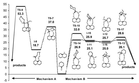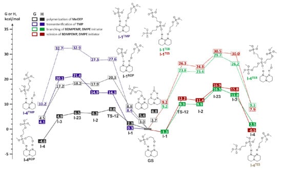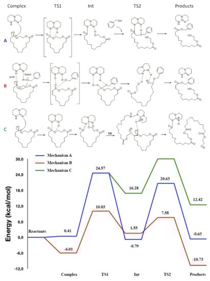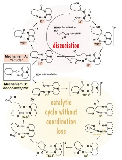 Mecerreyes et al. performed comparative DFT modeling of the initiation stage of TBD-catalyzed polymerization of ethylene brassylate macrolactone [] at the M06-2X/6-31+G(d) [,] level. The comparison of the energy reaction profiles (Figure 18) allowed for drawing a conclusion about the preference of the hydrogen-bonded mechanism B. Thus, TBD, in combination with the ROH initiator, catalyzed the ROP of moderately strained lactones and lactide acting as an acid and base simultaneously, activating both cyclic ester and ROH via the formation of two hydrogen bonds.