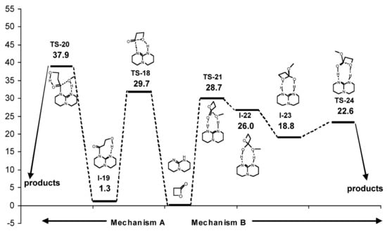 In contrast to δVL, β-butyrolactone (βBL) was inactive in TBD-catalyzed ROP at 25 °C. This difference was explained in [] by the results of the calculations of TBD-catalyzed β-propiolactone methanolysis (Figure 16). Unlike δVL methanolysis, in the case of four-membered lactone, Gibbs free energy barriers for nucleophilic addition of TBD (Mechanism A) and methanol acid-base addition (Mechanism B) were similar. The formation of the stable N-acyl adduct (I-19, Figure 16) was highly probable, but the following TS-20 (ΔG = 36.6 kcal/mol) looked unattainable under the mild reaction conditions. However, at elevated temperatures, TBD was able to catalyze polymerization of βBL []. The formation of TBD end-capped polymers confirmed the amide mechanism A, which was updated in this work by the assumption of zwitterionic intermediate formation from I-19, and by the detection of the products of I-19 dehydration as the C(O)CH=CHMe end-groups.