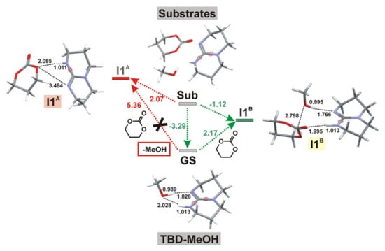 Energy profiles obtained by DFT calculations for TBD-catalyzed ring-opening methanolysis of trimethylene carbonate (TMC) for mechanisms A (red) and B (green). The colored version of the figure presented in []. Copyright (2015) Springer Nature.