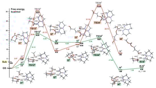 The lack of success in the search of the key insertion transition state was one of the notable results of the comparative modeling of l-LA ROP initiation in the frameworks of NM and HBM, resulting in stationary point 1a (NM, Scheme 2a). A hydrogen bond interaction was detected between the (imidazole)N–H and the carbonyl group, and this interaction inhibited the desirable interaction between this bond and exocyclic oxygen atom and prevented the nucleophilic attack of the imine nitrogen to the carbonyl. Thus, the HBM mechanism was found to be more plausible, and the propagation stage (Scheme 2b) was also studied; amide by the formula H2NC(O)CHMeOC(O)CHMeOH mimicking adenine end-capped ring-opened LA was used in the calculations. Figure 7 presents the energy reaction profiles for initiation and propagation stages. These profiles were in good agreement with experimental data, but did not reflect side reactions experimentally observed, in particular the formation of macrocycles. This aspect of organocatalyzed ROP is discussed in Section 4, Section 5, Section 6 and Section 7.
